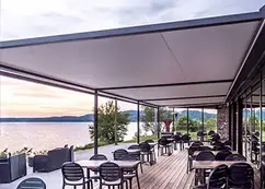 Configurando la pergola con l’aggiunta di vetrate scorrevoli oppure con il sistema di schermatura solare, è possibile completare la protezione anche lungo i lati della struttura.